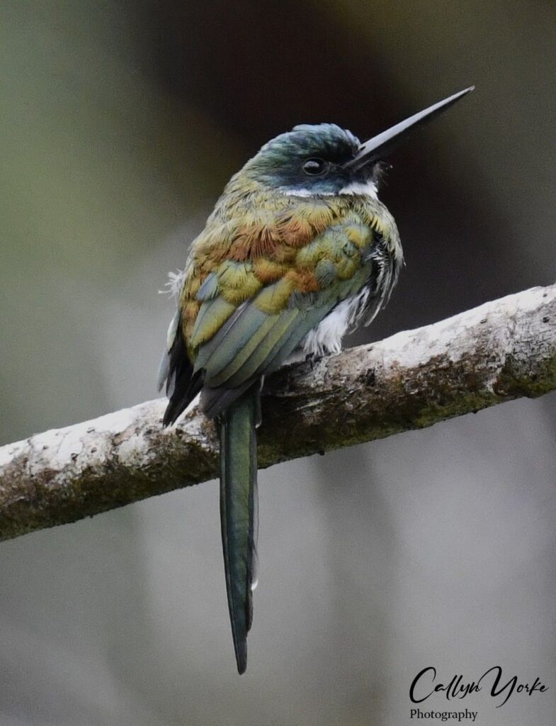 - Bronzy Jacamar Galbula leucogastra 2 sallying from fruit trees and utility wire; aerial hawking large insects, MM (photo).