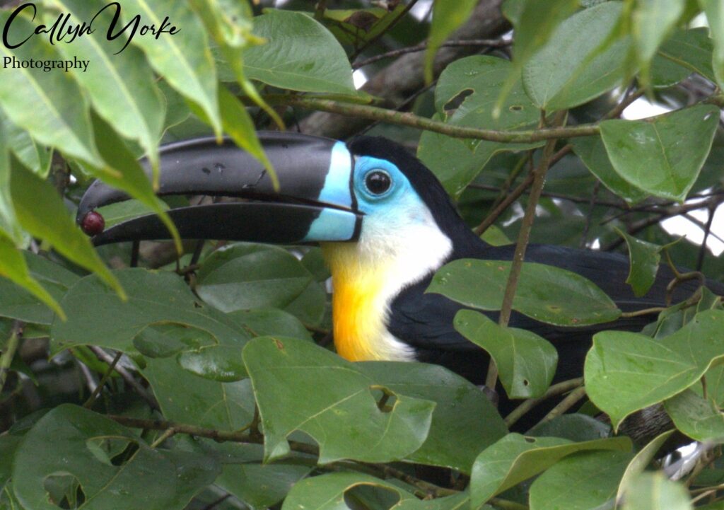 - Channel-billed Toucan Ramphastos vitellinus 2 greg. pairs in canopy of fruiting trees, MM, (photo).