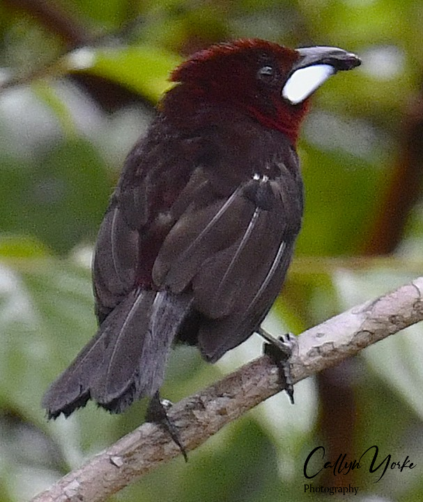 - Capuchinbird Perissocephalus tricolor 1 vocal an individual active in the high tree canopy of the interior forest; furtive and difficult to approach; vocalizations occasionally heard from the lodge dining area – far carrying moaning-like sounds MM.