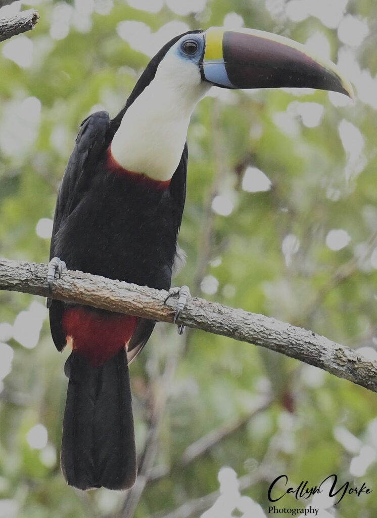 - White-throated Toucan Ramphastos tucanus 4 voc. greg. in canopy of forest fruiting trees, MM, MUS (photo).