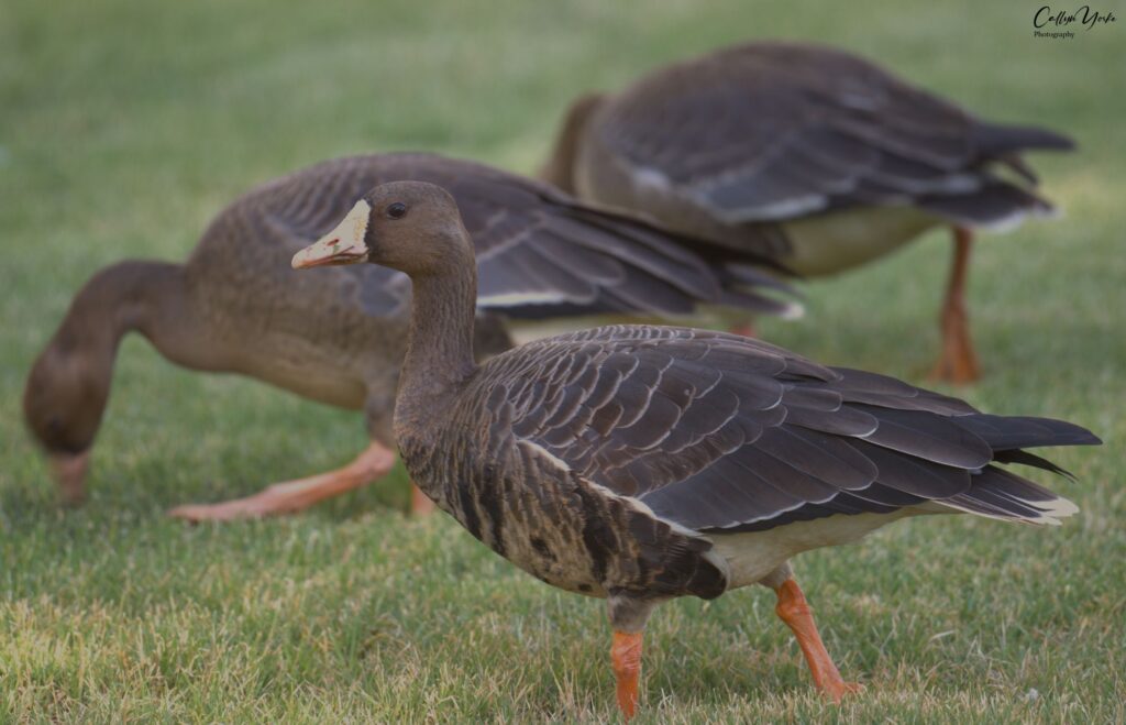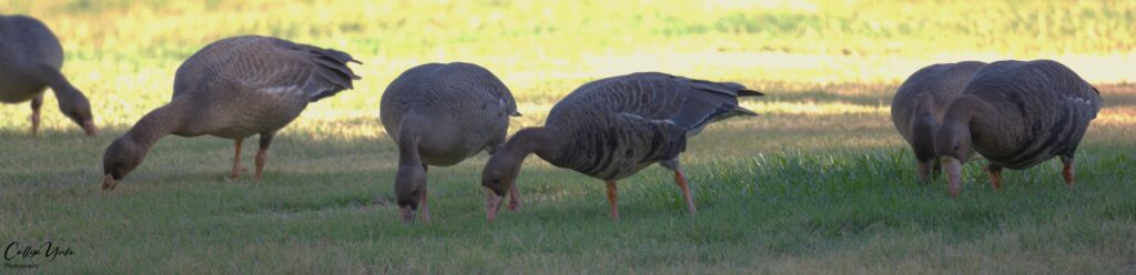 - Greater White-fronted Goose 7 (3 ad., 4 imm.) a cohesive flock of six birds (one bird foraging a few yards away from the others) foraging on the lawn grass; wary and moving away quickly but reluctant to fly as I approached for photos; this appeared to be a cohesive, migratory flock, not seen associating with other waterfowl in the park (photos).