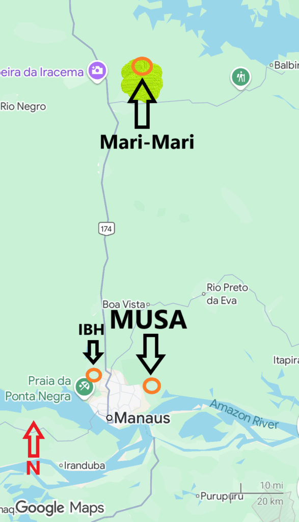 Annotated map showing principal bird survey sites in Amazonas, Brazil: Refugio Mari-Mari, Presidente Figueiredo; Manaus Museum of Natural History (MUSA) and Ibis Manaus Airport Hotel (IBH).. Courtesy of Google Maps 2025
