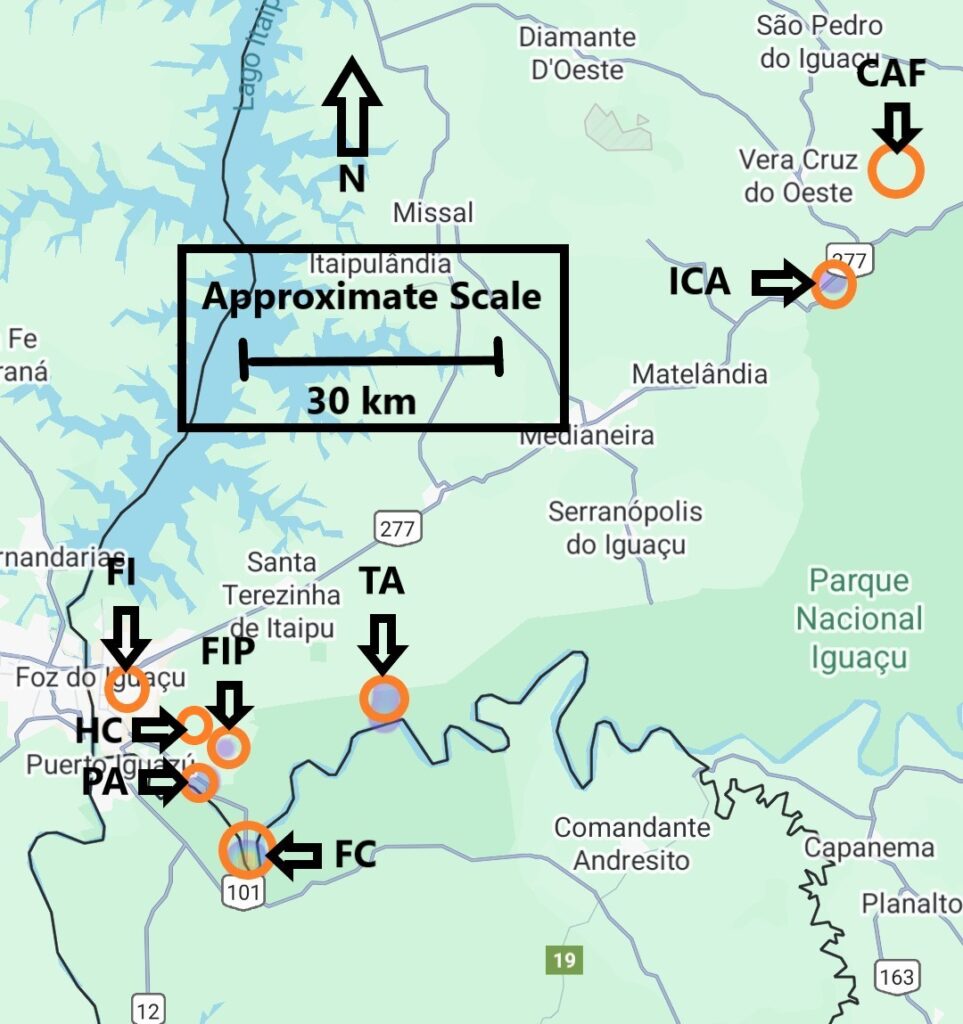 Following the experience at Parque das Aves, and finding limited birding opportunities within walking distance of Hotel Colonial, I was motivated to contact a local bird guide. Jeanne Martin from Jamacá das Araras Lodge, Mato Grosso, put me in contact with Marcelo da Rocha – a competent, polylingual, professional guide, who lived in Iguazu Falls. Since it was ‘off season’ for bird tours in Brazil, he had time to show me around the Iguazu Falls area. Marcelo enriched the last two days of my visit with his birding expertise at multiple locations – each with its own diverse community of birds.