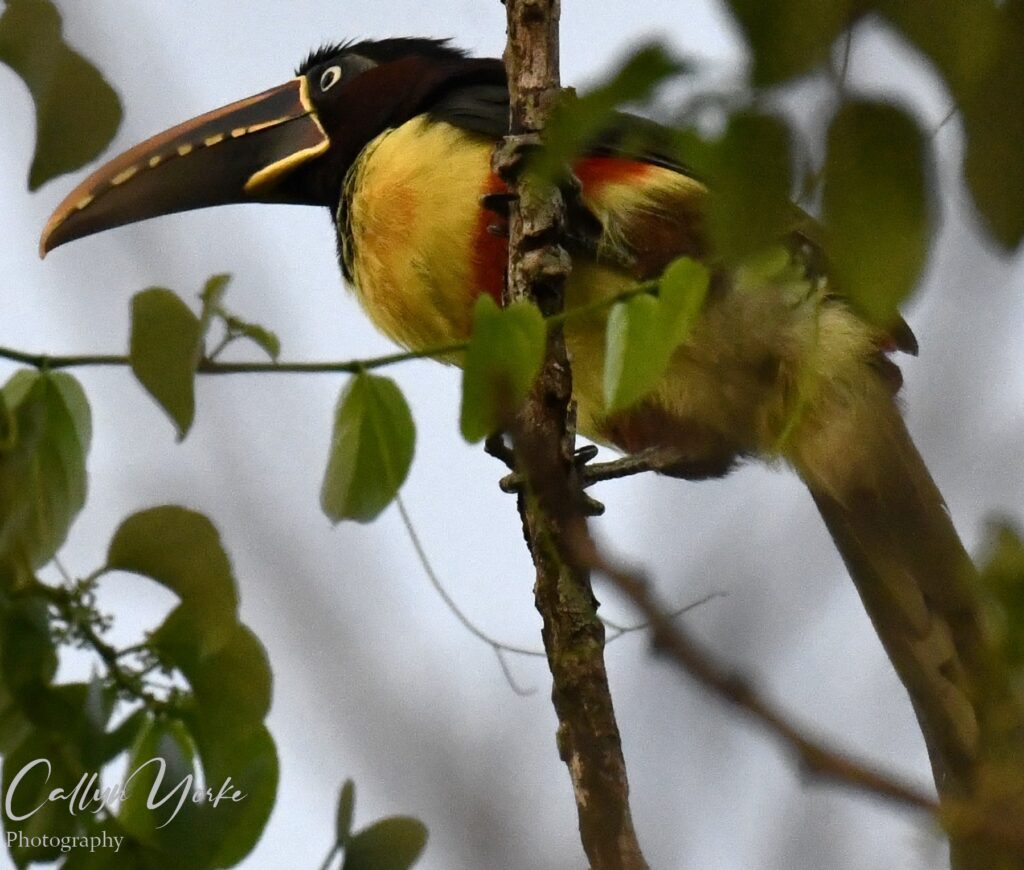 - Chestnut-eared Aracari Pteroglossus castanotis 2 in a residential, street-side tree canopy, FI; ICA (photo).