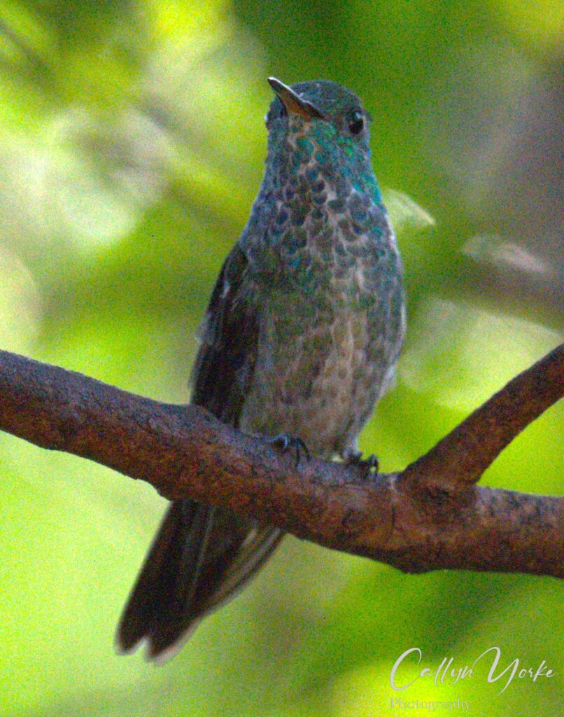 - Versicolored Emerald Amazilla versicolor 1 msf of hummingbirds (see BTMA) at sugar-water feeders, FI; TA.