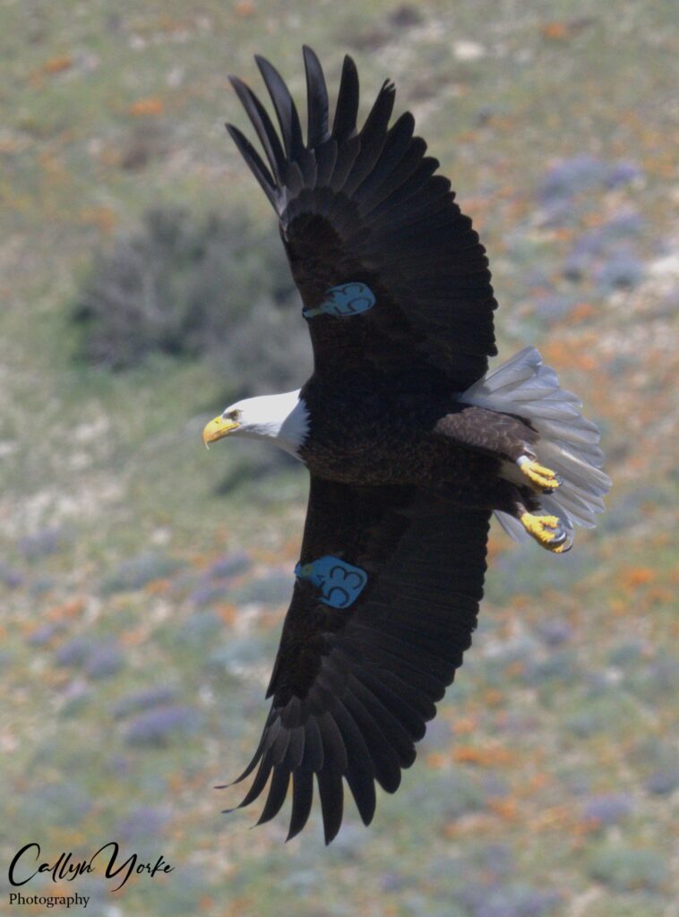 - Bald Eagle 1 (ad. with wing tags # 53) on an exposed snag, then flushed; about 30 yards from the south lakeshore, east WEL, photographed from west pathway through chaparral (photo).