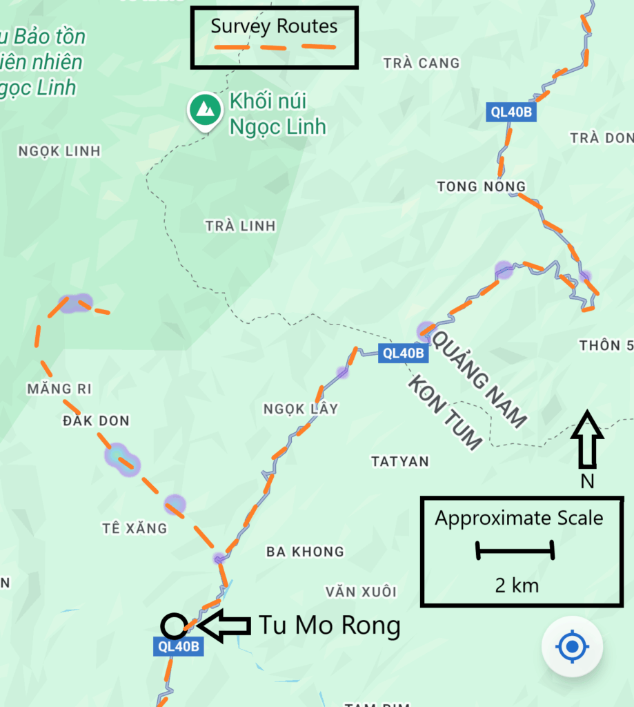 The next morning, Minh figured our time traveling would be best spent at some new locations on the road, bypassing Ngọc Linh and heading northeast. We had more than one-hundred km to cover, mainly on slow mountain roads. It would be a tight birding schedule, if we were to find accommodations in Núi Thành before dark. After breakfast, we said our goodbyes to the kind folks at Hotel Tu Mơ Rông and continued on our Việt Nam road trip.