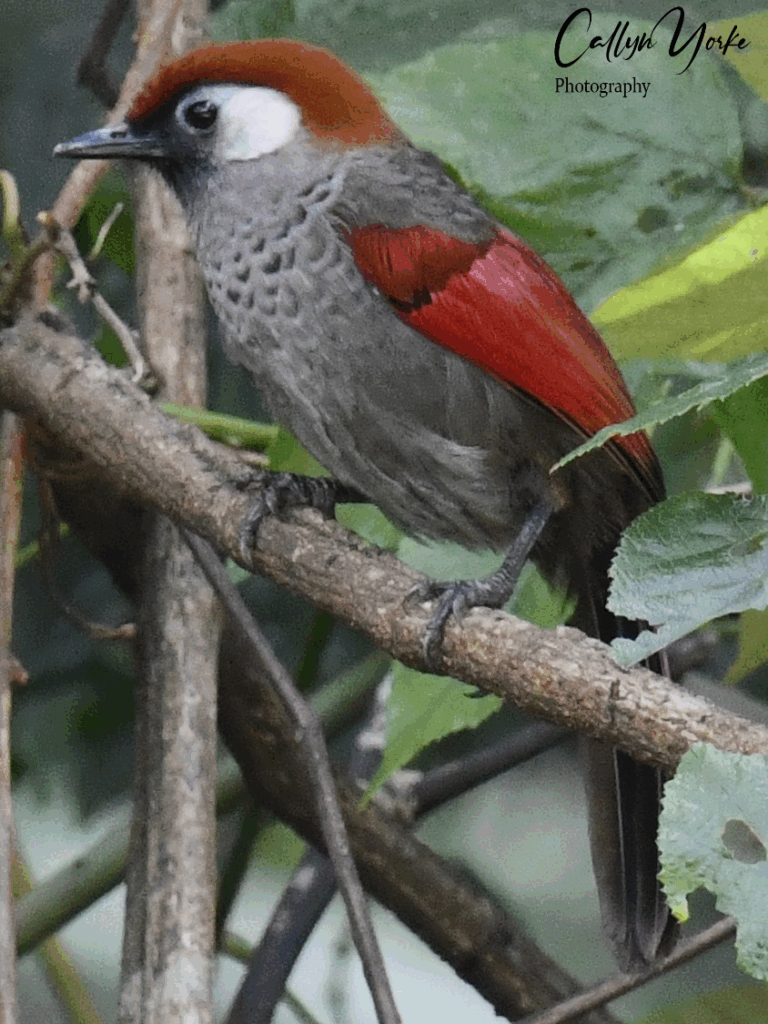 - Red-tailed Laughingthrush Trochalopteron milnei 4 greg. voc. pos. response to rec. playback; flying from forest to roadside forest and second-growth, NL.