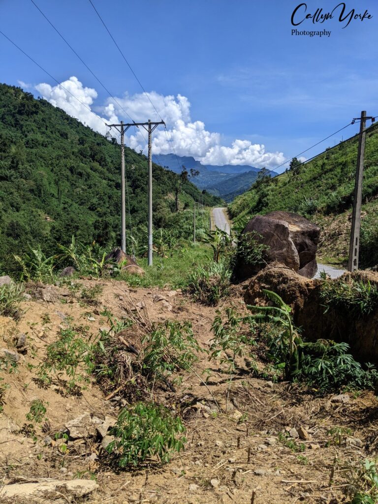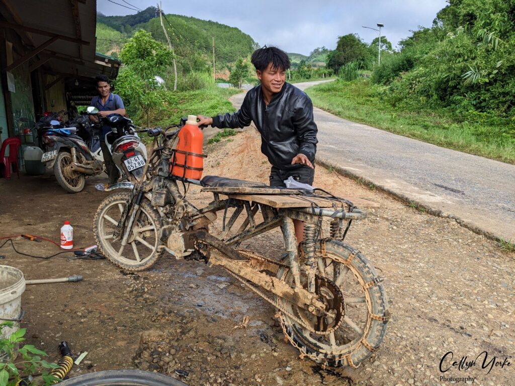 We hadn’t gone far when a series of landslides required of Minh a bit of off-road driving skill. Apparently, such inconveniences were common. If you were driving a car through this area, it had better have high ground clearance, or you might be selling it to the locals for parts. Forget being in a rush for work. A three-legged dog could get through Măng Ri faster than anyone traveling by car or bus.