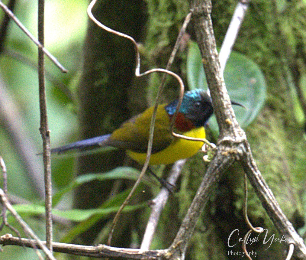 - Green-tailed Sunbird Aethopyga nipalensis 2 (m,f) highly active at edge of a forest clearing, understory, NL (photo); QL 40B.