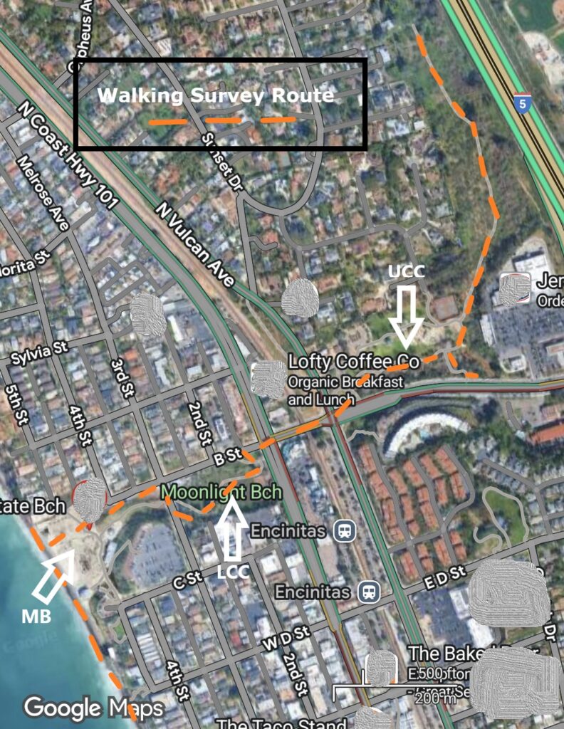 Areas Covered 1) Encinitas: Eight morning transects (0630-0930), one afternoon transect (1340-1640 hrs.) beginning and ending at Moonlight Beach (MB), including adjacent Encinitas suburbs (ES), lower and upper Cottonwood Creek Ecological Preserve (LCC, UCC). Multiple casual surveys through Encinitas commercial and suburban districts. COVID-19 pandemic advisories posted everywhere. Face coverings worn by the majority of pedestrians; most small businesses remained open during my visit, including hotels; most restaurants were open for outside dining and take-out. Large weekend/holiday crowds in town and on beaches.
