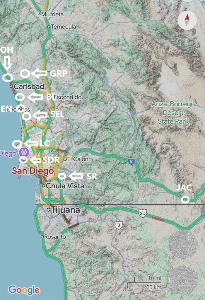 5) Leucadia suburbs adjacent to I-5 and Leucadia Blvd (LB – 6 December, 0845-1009 hrs. 6) Fiesta Island (FI – 9 December, 0805-0953 hrs), including dog park and adjacent shorelines and lagoons. 7) Coronado Island (CI – 9 December, 1015 -1155 hrs.), shore and breakwater adjacent to Hotel Del Coronado, Vietnam War Naval Memorial park and bay shore. 8) Oceanside Harbor, breakwater, beach and San Luis Rey River mouth (OH – 11 December, 0704-0834 hrs.). 9) Capistrano Park, Oceanside (CPO – 0847 – 1050 hrs.). 10) San Diego Botanical Garden, Encinitas (BG – 13 December, 1000-1150 hrs.). 11) Guajome Regional Park, Oceanside (GP -14 December, 0736-0920 hrs.).