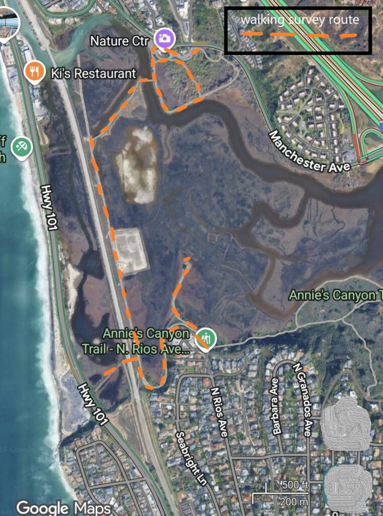 I made two walking surveys of San Elijo Lagoon (SEL), the first, beginning at the Visitor’s Center; the second from North Rios Ave. Both surveys included the southwest corner marsh under the railroad bridge (see the following satellite map image). Multiple joggers and people with leashed dogs were present during both surveys. The marshlands had relatively high water levels; both surveys with an outgoing tide. Waterfowl were abundant throughout the central and eastern portion of the marsh and lagoon. Highlights included, Blue-winged Teal, Reddish Egret and Peregrine Falcon.